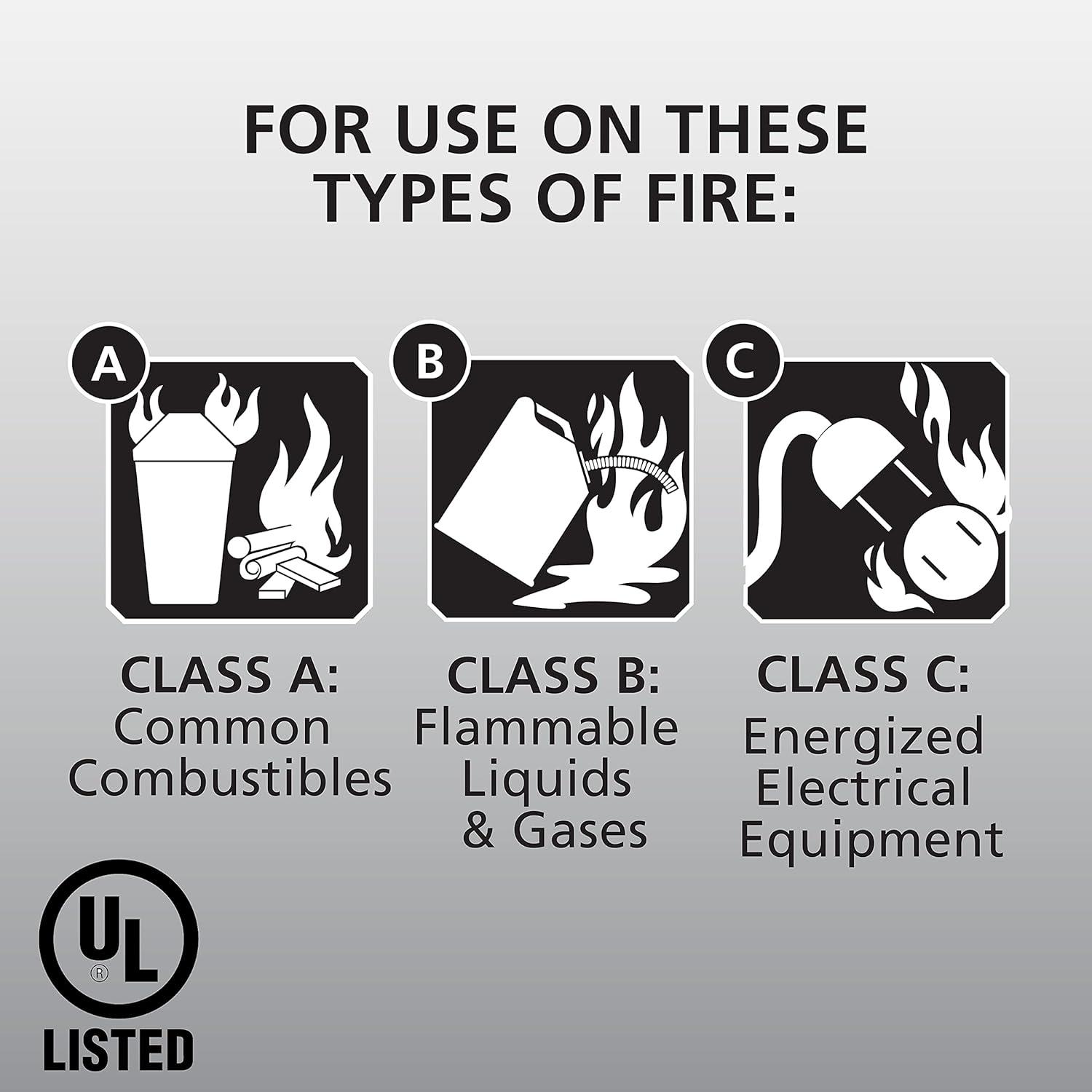 Use to fight basic fires common to the home & office: combustibles including trash, paper & wood (Class A), flammable liquids and gases (Class B) & electrical equipment (Class C)
