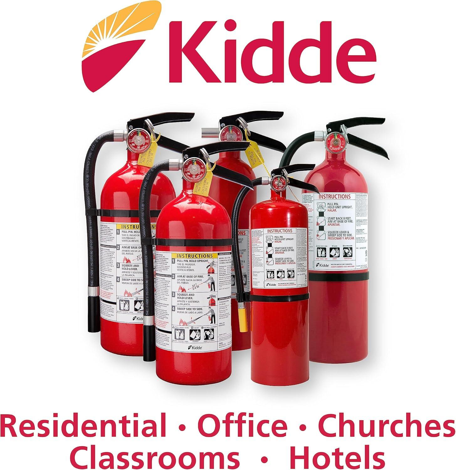Keep your home and family safe with the Kidde Fire Extinguisher for Commercial Use, 3-A:40-B:C, designed to fight basic fires common to the home involving common combustibles such as trash, wood, & paper (Class A), flammable liquids and gases (Class B), & electrical equipment (Class C). Manufactured from lightweight aluminum, and weighing 9 lbs.., the Kidde home fire extinguisher is easy to handle and provides a discharge time of 13-15 seconds, a discharge range of 12-18 feet, and an operating pressure of 195 PSI. The cylinderis filled with 5.5 lbs.. of monoammonium phosphate fire-fighting agent. The painted aluminum handle, aluminum cylinder, metal valve, and impact-resistant handle make the Kidde home fire extinguisher tough, reliable, and dependable in the event of a fire. The easy-to-pull safety pin, easy-to-read pressure indicator, and instruction label provide clear steps to operate the fire extinguisher – including a bilingual nameplate. Simply follow the PASS guide: pull the pin, aim at the base of the fire, squeeze the lever and handle, and sweep from side to side. This Kidde Commercial fire extinguisher is refillable and rechargeable by a certified professional after use. Hose and UL-approved wall mount included. USCG approved with strap bracket (NOT included). UL Listed. 6-year limited manufacturer's warranty. Note that the dry chemical agent in this ABC fire extinguisher is non-toxic but may cause skin irritation.