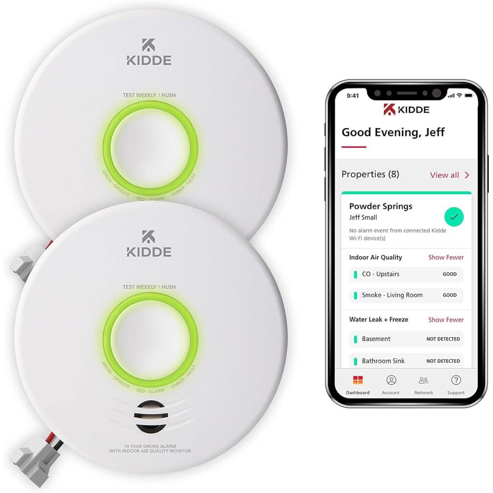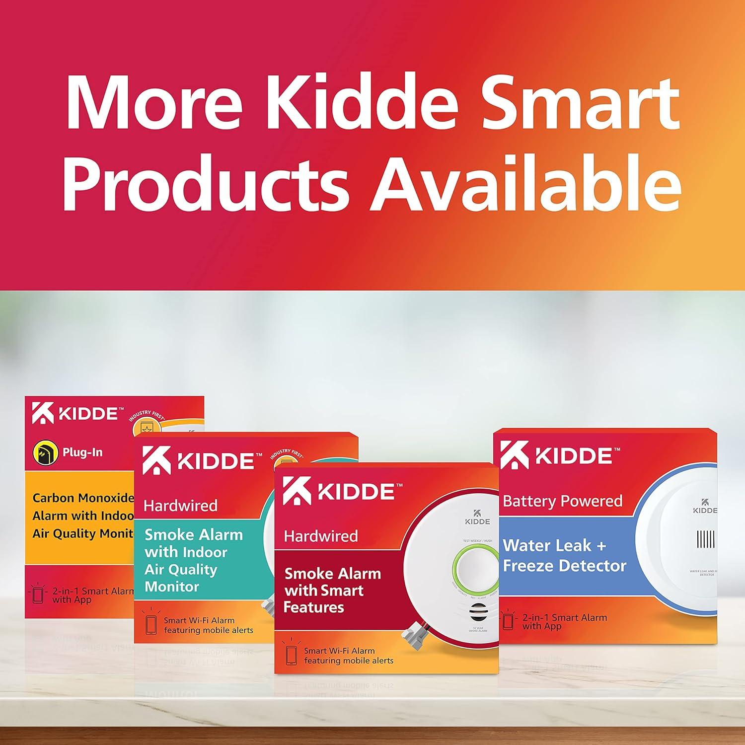 The Kidde Smart Smoke Detector & Indoor Air Quality Monitor, WiFi, Alexa Compatible Device, Hardwired with Battery Backup, Voice & App Alerts Value Pack, models P4010ACSAQ-WF, is an industry-first, combination smoke alarm & indoor air quality monitor. The Kidde smart hardwired smoke alarm uses photoelectric sensor technology to detect visible fire particles, associated with smoldering fires, and alerts you by sounding an 85-decibel alarm with a voice alert announcing “Fire! Fire!”. The Kidde smoke alarm connects to your home's wiring using standard 120V AC power voltage & provides battery backup in the event of a power failure. The lithium battery backup lasts the full 10-year life of the alarm, so you'll never have to replace a battery. Up-to-date, real-time notifications are provided through the Kidde app, so your family & friends – even the pet sitter – can monitor your home's air quality & receive alerts to smoke presence, high humidity levels that can lead to mold, or Total Volatile Organic Compounds (TVOCs). Setup is easy: simply download the Kidde app, & scan the QR code at the back of the smoke alarm. You can also use voice commands to check the connection & status of carbon monoxide or air quality by pairing it with your Amazon Alexa, Google Home, and select iPhone & Android smart devices. The LED ring-light indicator alerts you to the unit's operational status: red = a smoke or fire hazard, amber = operating error, and green = normal operation. The Test-Hush button silences temporary nuisance alarms, tests if the unit is operating properly, & silences a low battery or end-of-life chirp (up to 24 hours at a time for a maximum of 7 days). Capable of hardwired interconnection to other select Kidde alarms for whole-home activation – when one alarm sounds, they all do**. UL Certified with a 10-year limited warranty (not a battery performance claim). **Alarms only connect with select Kidde alarms that have hardwired AC interconnect capability (see User Guide).