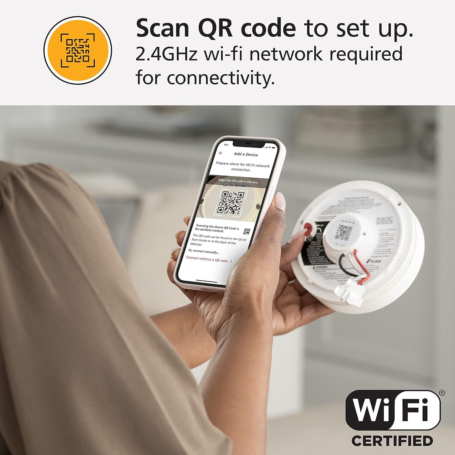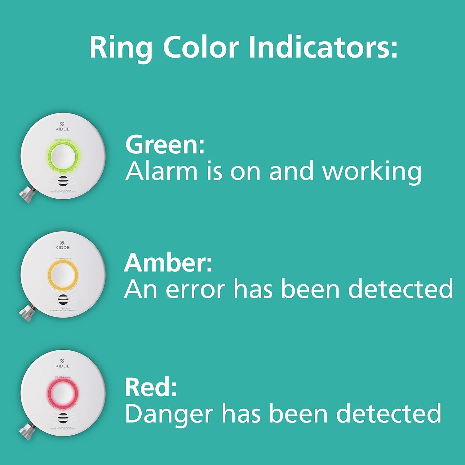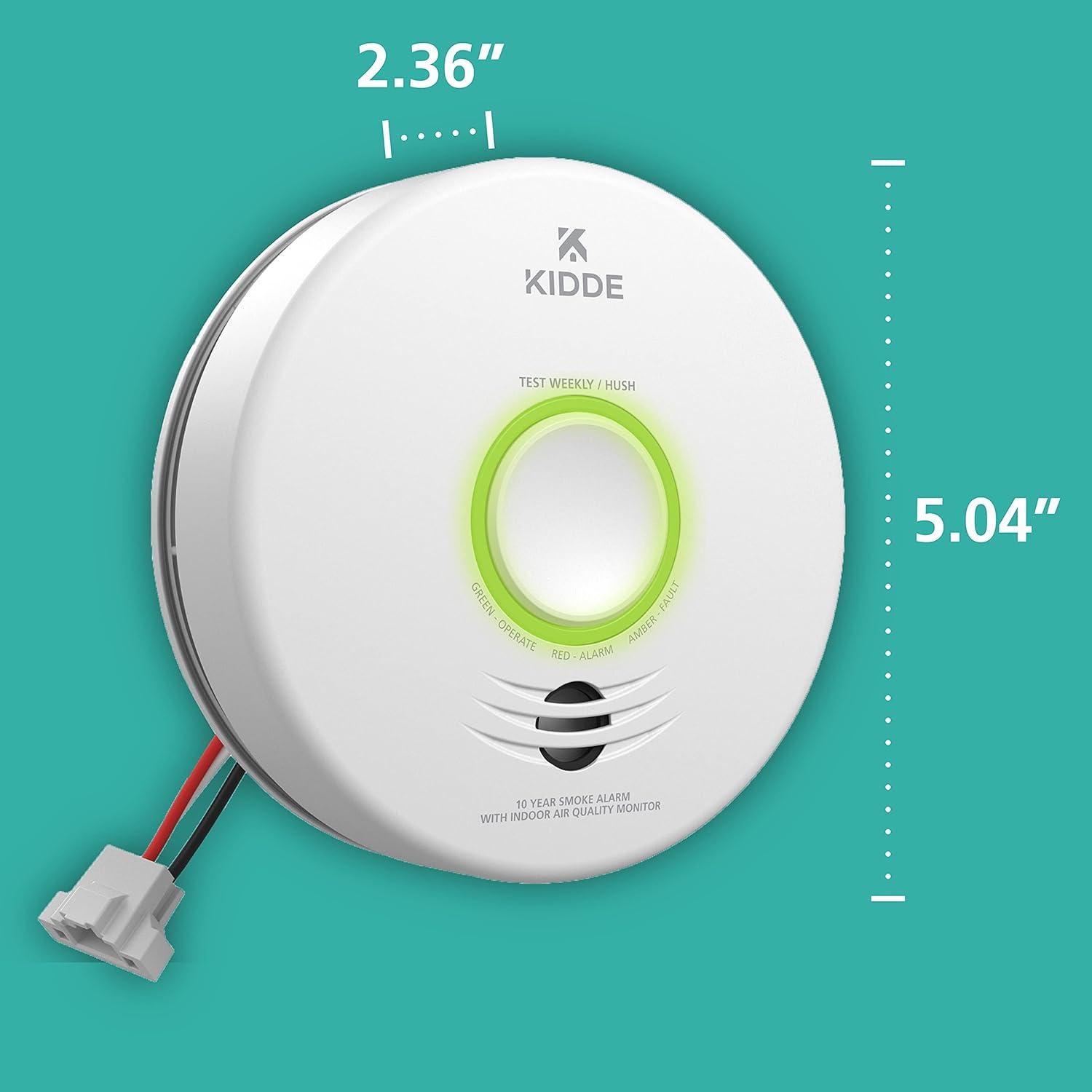 The Kidde Smart Smoke Detector & Indoor Air Quality Monitor, WiFi, Alexa Compatible Device, Hardwired with Battery Backup, Voice & App Alerts, model P4010ACSAQ-WF, is an industry-first, combination smoke alarm and indoor air quality monitor. The Kidde smart hardwired smoke alarm uses photoelectric sensor technology to detect visible fire particles, associated with smoldering fires, & alerts you by sounding an 85-decibel alarm with a voice alert announcing “Fire! Fire!”. The Kidde smoke alarm connects to your home's wiring using standard 120V AC power voltage & provides battery backup in the event of a power failure. The lithium battery backup lasts the full 10-year life of the alarm, so you'll never have to replace a battery. Real-time notifications are provided through the Kidde app, so your family & friends – even the pet sitter – can monitor your home's air quality & receive alerts to smoke presence, high humidity levels that can lead to mold or Total Volatile Organic Compounds (TVOCs). Setup is easy: simply download the Kidde app, and scan the QR code at the back of the smoke alarm. You can also use voice commands to check the connection & status of carbon monoxide or air quality by pairing it with your Amazon Alexa, Google Home, and select iPhone & Android smart devices. The LED ring-light indicator alerts you to the unit's operational status: red = a smoke or fire hazard, amber = operating error, and green = normal operation. The Test-Hush button silences temporary nuisance alarms, tests if the unit is operating properly, and silences a low battery or end-of-life chirp (up to 24 hours at a time for a maximum of 7 days).Capable of hardwired interconnection to other select Kidde alarms for whole-home activation – when one alarm sounds, they all do**. UL Certified with a 10-year limited warranty (not a battery performance claim).**Alarms only connect with select Kidde alarms that have hardwired AC interconnect capability (see User Guide).